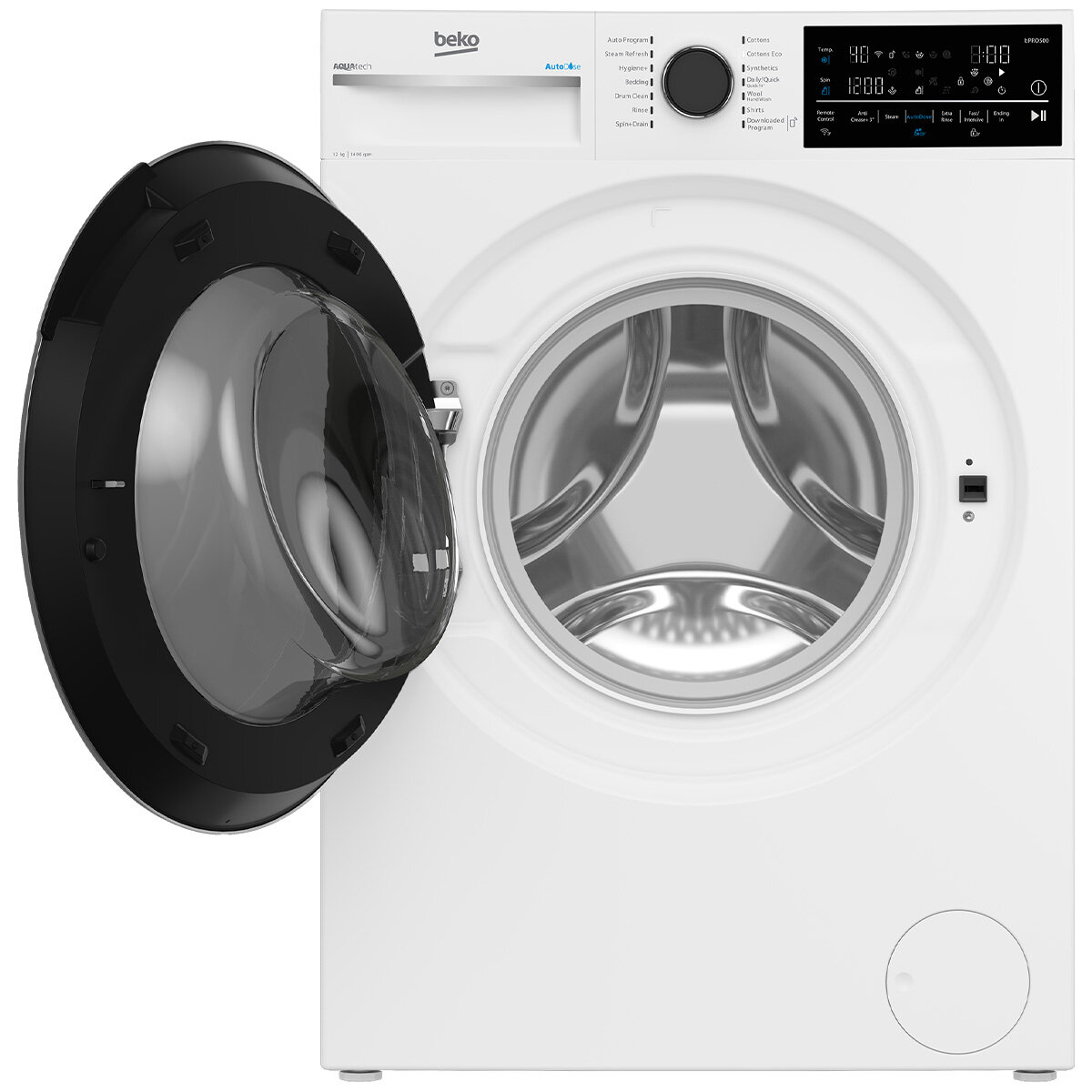 This Beko front‑load washer offers a large 12 kg capacity that easily handles big and bulky loads, making it ideal for families or anyone with frequent laundry needs. Its AutoDose system automatically measures and dispenses the right amount of detergent and softener, which simplifies each wash and helps avoid waste or residue on clothes. The SteamCure Hygiene+ programme uses steam to heat water up to around 60 °C, effectively reducing allergens and providing deeper cleaning — a great feature for allergy sufferers or households with pets and kids. Wi‑Fi connectivity via the HomeWhiz app gives you remote control and monitoring from your smartphone, along with custom programs and notifications. Technologies like AquaTech and ProSmart inverter motor deliver gentler and more efficient washing, reduced cycle times, quieter operation, and better energy performance overall. With multiple wash programs (including steam refresh and hygiene cycles) and practical extras such as AddGarment, AntiCrease+, and time‑remaining display, this machine combines convenience, performance and smart features that make laundry easier and more effective.